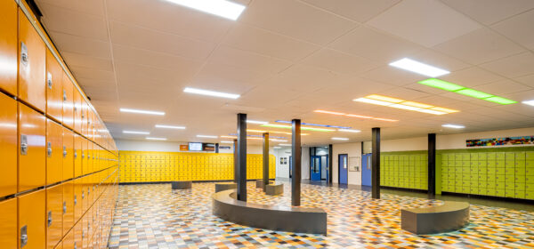 De sfeer in het gebouw is rustig en gezellig. In de vrolijke aula, de overblijfruimte, de hal en op het buitenplein met het naastgelegen sportveld is er plek voor de 1.750 leerlingen en medewerkers.