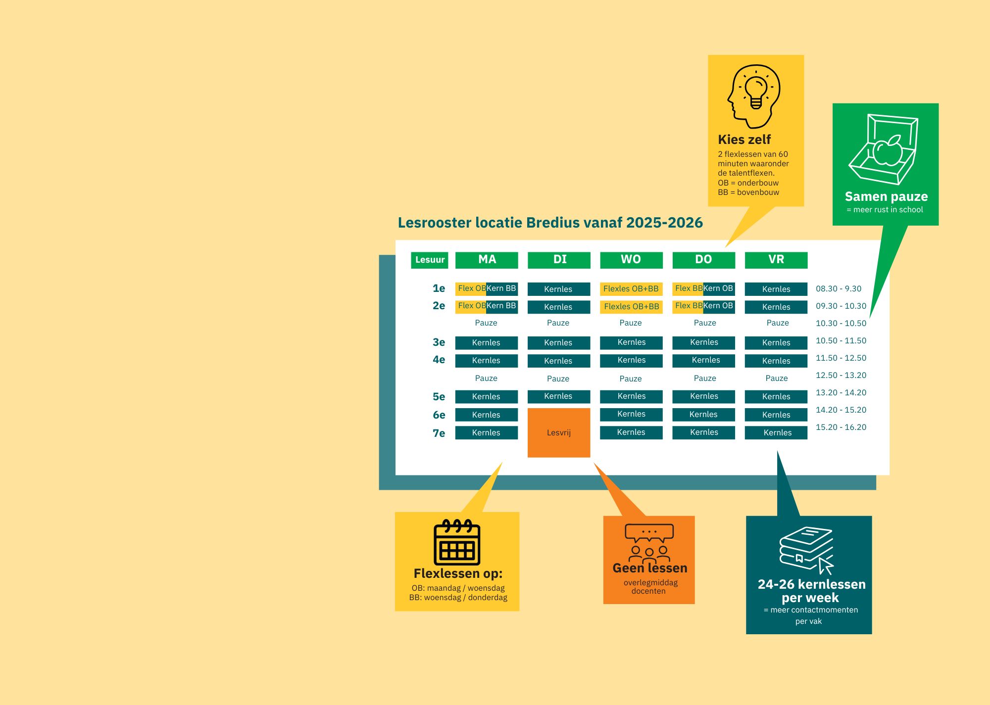 Op locatie Bredius werken we met een flexrooster. Elke leerling volgt een combinatie van kernlessen en flexlessen. Deze mix biedt ruimte voor maatwerk én zorgt voor een duidelijke, overzichtelijke schooldag.