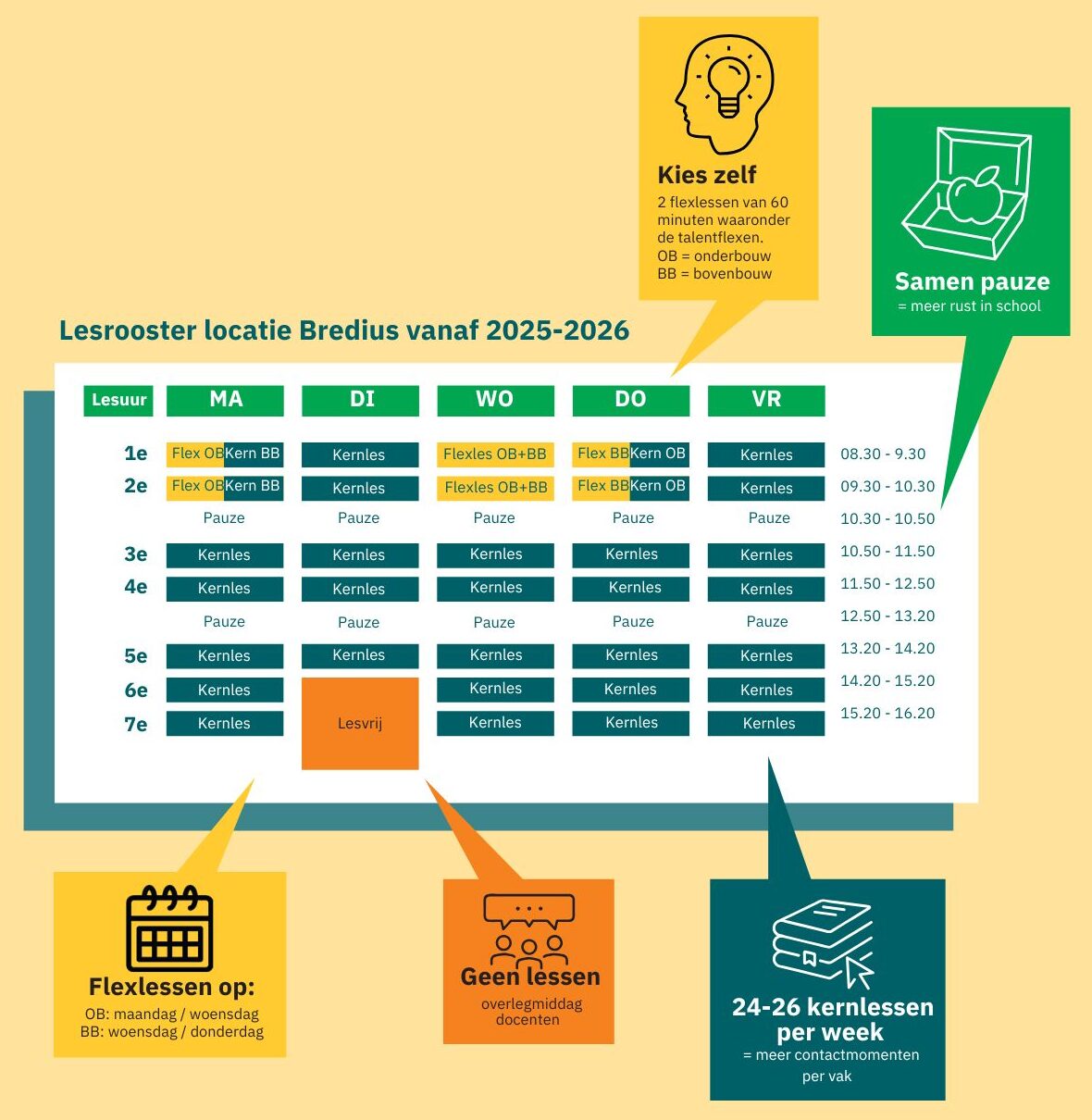Op locatie Bredius werken we met een flexrooster. Elke leerling volgt een combinatie van kernlessen en flexlessen. Deze mix biedt ruimte voor maatwerk én zorgt voor een duidelijke, overzichtelijke schooldag.